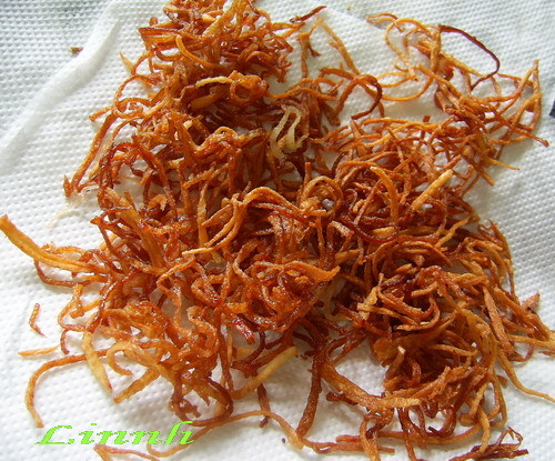 每一条蟹柳打开重叠,像切姜丝那样切细,大火炸一炸就好。果然很好吃。看来要多买些炸,要不还没到新年已给我吃光。 炸起来带红的蟹柳象征喜气洋洋的新年。