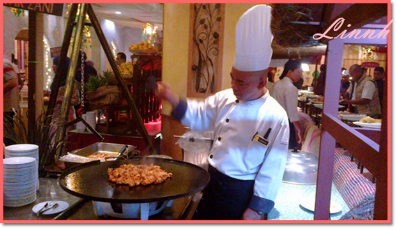 很乡土味的角落,这里有炸香蕉、cempedak、番薯、面包果、木薯、cekodok、懒人糕等等。我每天等她的炸cempedak等得很不耐烦。朋友Suzie 人长得甜美,嘴巴又涂油,每天都取一大碟cempedak 回座。我们去的时候那makcik 会说完了,她去绝对不空手而归。她的杀手锏是入乡随俗,酒店里人人叫那makcik ,“mummy”,她也嘴巴甜甜mummy,mummy 叫不停。听她称呼侍者的腔调不寒而栗,太过油腔滑调, 这点无法苟同。她解释默罕默德娶九岁小女孩为妻时所引用的例子;把我当主人,她是奴隶。自此我发号司令告诉她我的朋友们都想吃cempedak, 麻烦她这奴隶多走几趟以满足主子的要求。Suzie 是玩得起的人,不在乎当我的仆人,她一个晚上走几趟替我们取食物,大家颠得很开心。她常感恩地说马来西亚三大民族像我们这样坐下来开心吃饭是可遇不可求。 她懂得尊重他族的感受。