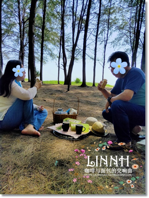 这里的沙滩有着浓密的松林,疏疏落落的阳光射入,在内野餐很舒服。沙滩上没什么人,我们可以尽情拍照。食物摆在厚厚的松针上,喜欢那画面。女儿谑笑说无人的食物照比有人的好看,嫌我们两老大煞风景。这小妮子拿着手机不断帮我们拍照,我和外子瞬间化身为韩剧里的男女主角。