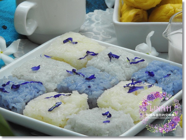 看到那么多榴莲,脑海里即刻想到榴莲糯米饭。家里有一大包干蝶豆花,拿来浸泡糯米,染上不同深度的蓝。蒸糯米要有技巧,蒸熟后才加入少许椰浆。我用香蕉叶把糯米裹紧,冷却后糯米变得很有弹性。椰浆加入少许盐煮一会以免放久变酸。准备就绪加入榴莲即可享用。我喜欢加入大量榴莲,咸咸的椰浆,甜甜的榴莲配上口感QQ的糯米,吃入口幸福满满。