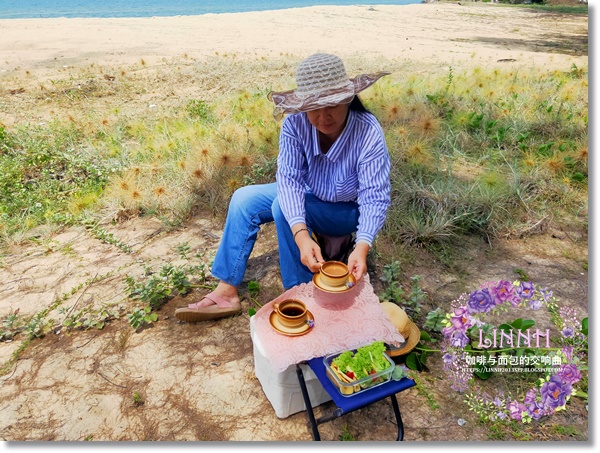 东西不多,搬下后即可着手准备食物。我那可爱的老公帮不上忙就拿着手机咔嚓咔嚓对准我拍了几十张照。很快的蔬菜乳酪蛋卷做好了,这东西养眼又简单,野餐有它生色不少。泡一杯咖啡、一杯奶茶,先摆姿势拍照,我与我的咖啡!两个人饿坏了,食物很快吃光。乍看这里还有点像沙漠,无意中拍出来的照片就像牛仔和牛女在沙漠上喝咖啡。两个牛仔牛女在研究这里的地理环境,讨论下一次要带什么食物和用具来野餐。年纪越大活得越随心所欲,学会不在乎人家的眼光,想怎么过日子就怎么过。
