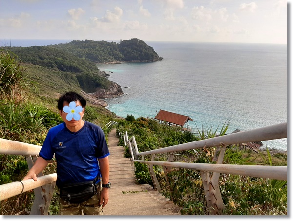 这里的梯级失修已久,大家相互提醒注意安全。他走了一段路后还贴心地转回头叫我紧抓扶手,有些梯级已被腐蚀烂掉了。感紧道谢,没有他的提议我走不到这里。从悬崖往下看真是太美了,走到一半就不能再下去,较低的阶级已经腐朽,不堪一踩。我好玩但会衡量情况,不想乐极生悲。费那么大的工程打造一条沿伸到海面上的梯级却没有定时维修,完全不顾游客安全。离岛后我给登州旅游局发建议书,官方回复感激我,心里清楚一定石沉大海,就像当初砂州的旅游局。之后才知道有人踩了个空被划伤,连伸与援手的人一并送院留医。