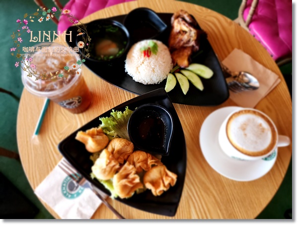 炎热的中午推开门走入感觉一阵清凉。内部设计昏暗中和了外面强烈的阳光。我和外子饿得肚子咕噜咕噜叫,不想吃面包蛋糕之类,只想来盘米饭。外子点了招牌鸡饭,以咖啡馆的装潢,那价钱很佛系。其他东西都不合我胃口,不爱肉也不要太大份,就点鸡肉炸云吞和一杯卡布奇诺。