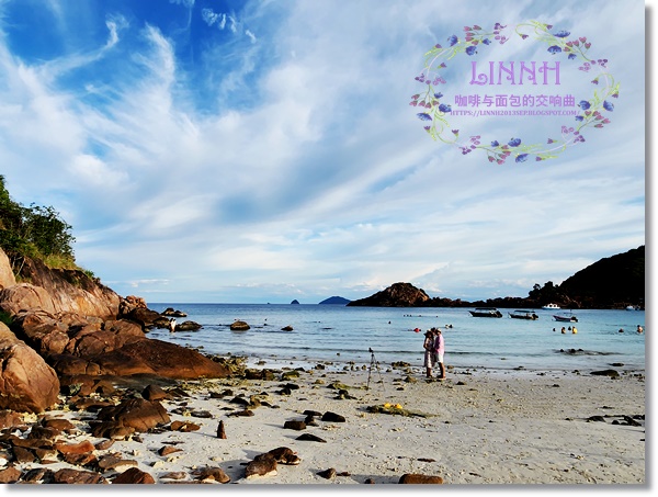 明天离岛,躺平的人听到要出外探索也无异议跟随。炎热的天气吃冰淇淋是最大的享受,我只爱酸酸的冰条,吃了精神一振。沿着沙滩走到另一个石堆,开始退潮,沙滩上露出一些岩石。弄潮人儿真多,一张张快乐的脸孔相互感染。情侣、闺蜜、带着小孩的父母、带着父母的孩子在沙滩上进行各种活动,浮潜、游泳、打排球、筑沙堡、挖螃蟹、嬉戏追逐..........。最吸睛的是一对外国情侣,长相像墨西哥电视剧里的演员,挺直的鼻梁、黑白分明的大眼睛。女的一身花裙子,手挽精心搭配的手提袋,头戴帽子,脚下穿一双好看的花凉鞋。男的一身沙滩装,头戴草帽,很帅。他们在沙滩上自拍,忘我的拥抱,是岛上美丽的风景。
