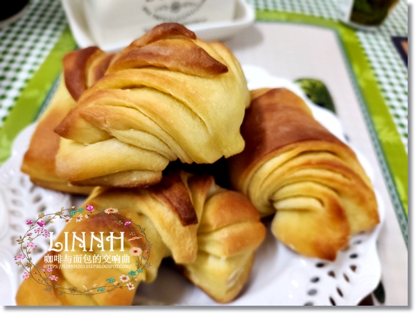 我没有在牛角包上涂蛋液,我喜欢一出炉就涂牛油让面包表面吸收牛油继而变得柔软。女儿放工回来受不了诱惑先尝一块,隔天让她带去上班,临出门前还顺手牵两个带上车吃。